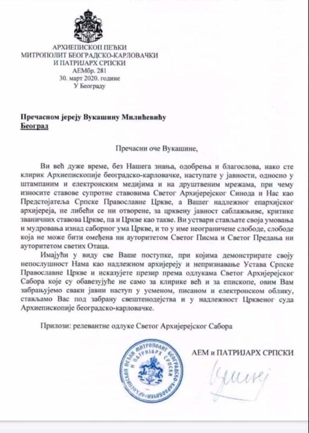 Jerej Vukašin Milićević, sveštenik Srpske pravoslavne crkve i docent na Pravoslavnom bogoslovskom fakultetu u Beogradu, kažnjava se zabranom nastupanja u javnosti u svakom obliku, stoji u dopisu koji je 30. marta 2020. godine potpisao patrijarh Irinej i u kome se sveštenik obaveštava da će se o njegovoj sudbini izjašnjavati Crkveni sud Arhiepiskopije beogradsko-karlovačke.
