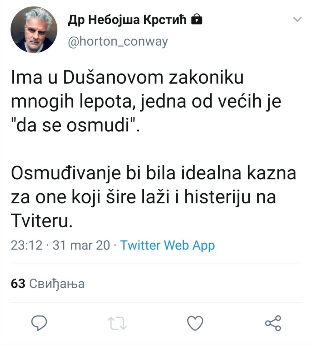 - Ima u Dušanovom zakoniku mnogih lepota, jedna od većih je "da se osmudi". Osmuđivanje bi bila idealna kazna za one koji šire laži i histeriju na Tviteru - napisao je on.