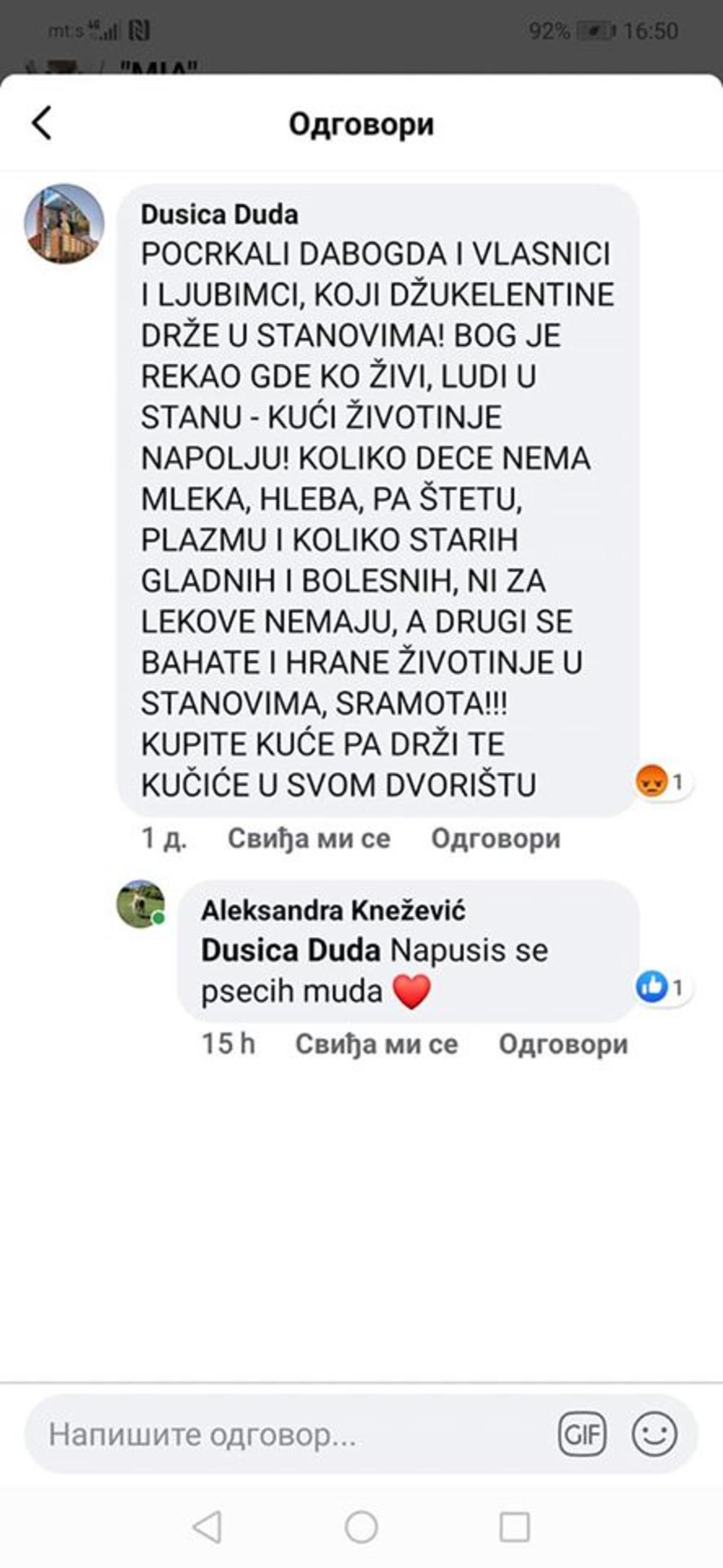 - Koliko dece nema mleka, hleba, paštetu, plazmu, kolko starih gladnih, bolesnih, ni za lekove nemaju, a drugi se bahate i hrane životinje u stanovima, sramota! Kupite kuće pa držite pse u dvorištima, poručila je gospođa, a da nije ni trepnula.