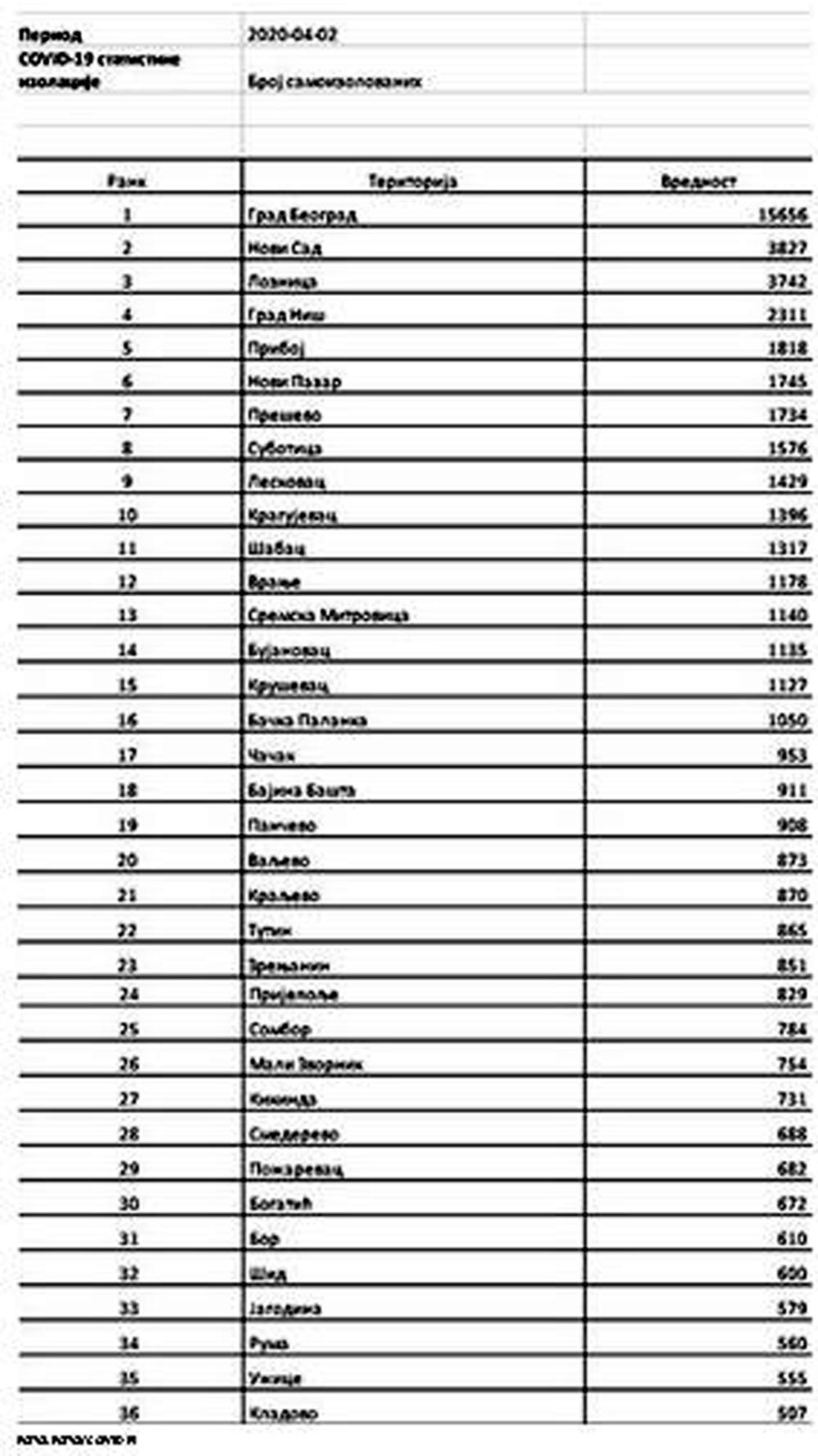 Prema broju samoizolovanih dalje slede Novi Sad sa 3.827, Loznica sa 3.742, Niš sa 2.311 i Priboj sa 1.818 ljudi u samoizolaciji.