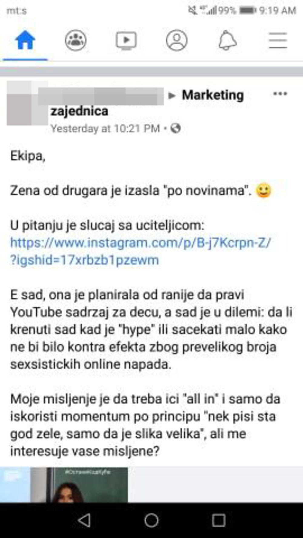 - Ekipa, žena od drugara je izašla "po novnama". U pitanju je slučaj sa učiteljicom. E sad, ona je planirala da pravi Jutjub kanal za decu, a sada je u dilemi, da li krenuti sad kad je "hype" ili sačekati malo kako ne bi bilo kontra efekta zbog velikog broja seksističkih komenara, pita čovek koji tvrdi da je nastavica likovnog supruga njegovog drugara.