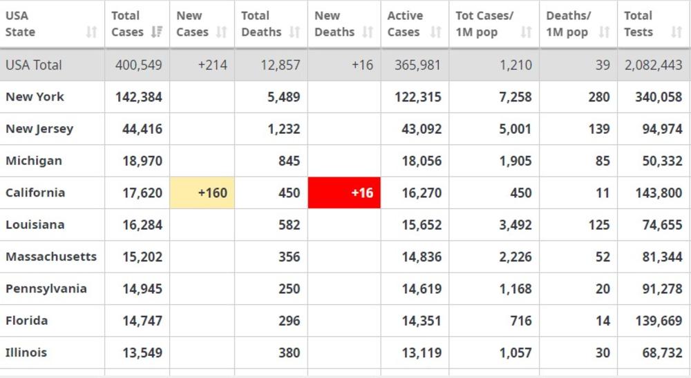Takođe, ako se osvrnemo na podatke sa zapadne obale SAD-a, vidimo da je prema poslednjim podacima u saveznoj američkoj državi Kaliforniji od koronavirusa obolelo 17. 620 ljudi. Isto tako, na redovnom brifingu, prema najnovijim informacijama, prijavljeno je 160 novih slučajeva u ovoj državi koji su zaraženi koronavirusom, a preminulo je 450 ljudi, piše worldometers.info.