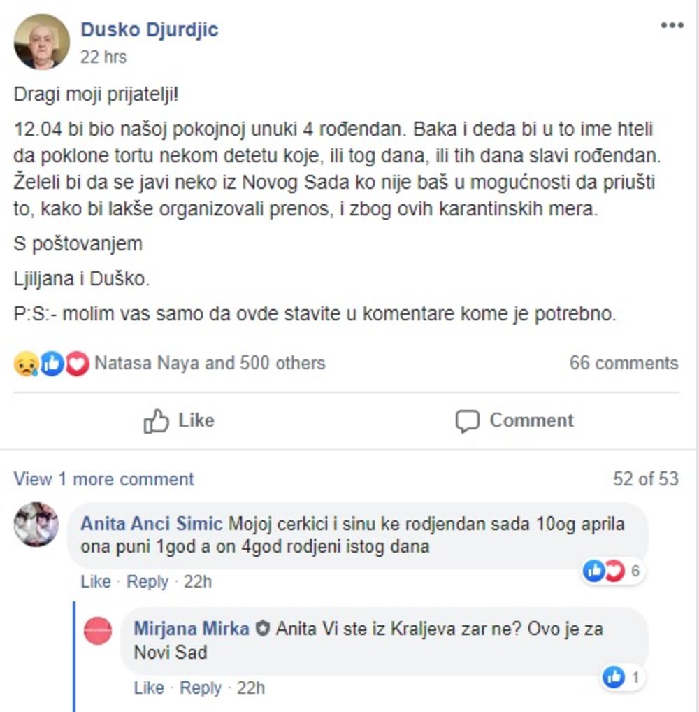 - Dragi moji prijatelji! 12.04. bi bio našoj pokojnoj unuki 4. rođendan. Baka i deda bi u to ime hteli da poklone tortu nekom detetu koje, ili tog dana, ili tih dana slavi rođendan. Želeli bi da se javi neko iz Novog Sada ko nije baš u mogućnosti da priušti to, kako bi lakše organizovali prenos, i zbog ovih karantinskih mera. S poštovanjem, Ljiljana i Duško, stoji u statusu.