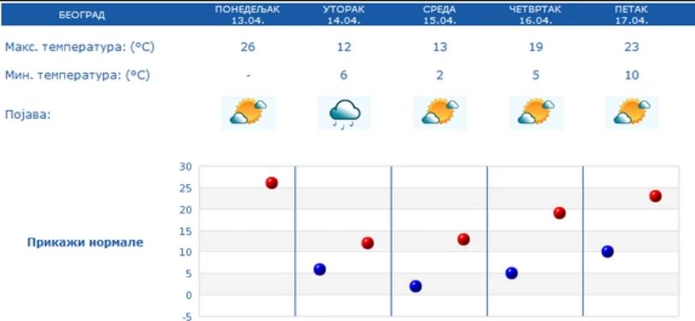 Prema podacima Republičkog hidrometeorološkog zavoda od 13.00 časova, u skoro celoj zemlji je toplo i sunčano, sa temperaturama od 20 do čak 26 stepeni koliko je izmereno u Loznici (u Nišu 23, Beogradu 24, Novom Sadu 25...) . Međutim, sutra će biti i za 15 stepeni hladnije.