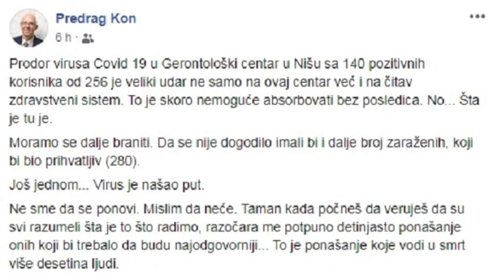 “Koliko vidim po Fejsbuku glavni “krivac” za prodor virusa u Gerontološki centar u Nišu sam ja i stručni tim. Vreme je da se zbog toga povučem i prepustim boljima da vode pandemiju. Bolje ne znam i ne umem. “Ratove” neću da vodim ni protiv koga, osim protiv virusa. Neprekidno pratim sve misleće ljude i kako se sav gnev umesto na situaciju i sam virus okrenuo prema meni i stručnom timu vreme je da se sklonim. Privremeno isključenje... Sve najbolje!” napisao je dr Kon.