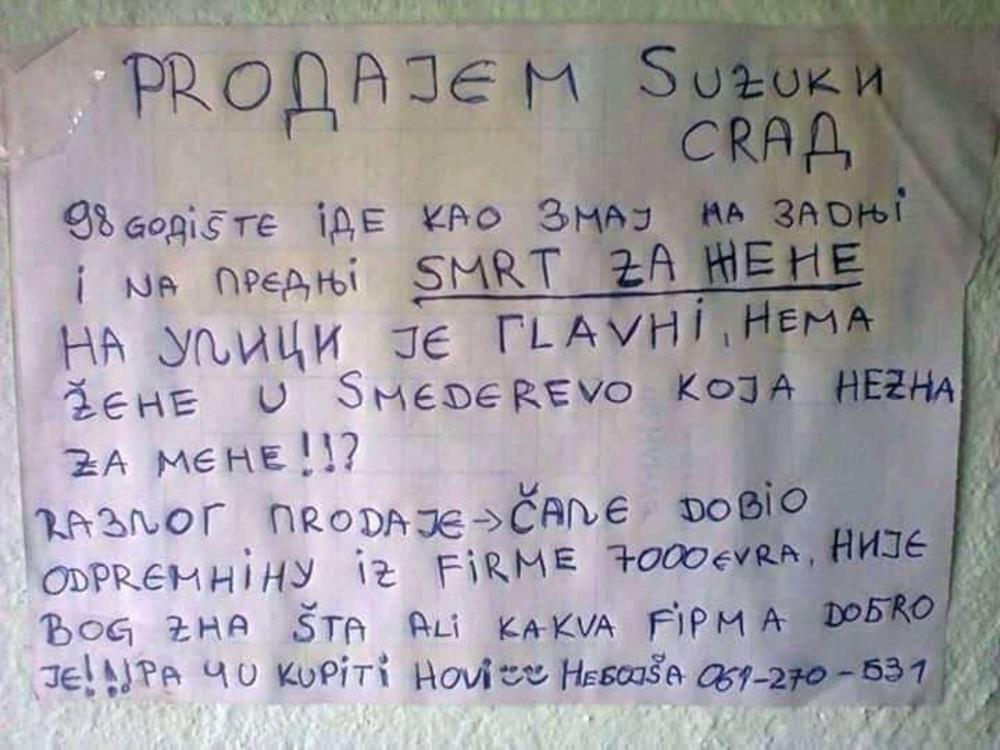 - Prodajem Suzuki, 98 godište, ide kao zmaj na prednji i na zadnji, "smrt za žene". Na ulici je glavni, nema žene u Smederevo koja ne zna za mene. Razlog prodaje, ćale dobio otpremninu iz firme 7000 evra. Nije Bog zna šta, ali kakva je firma dobro je. Pa ću kupiti novi, napisao je Nebojša.