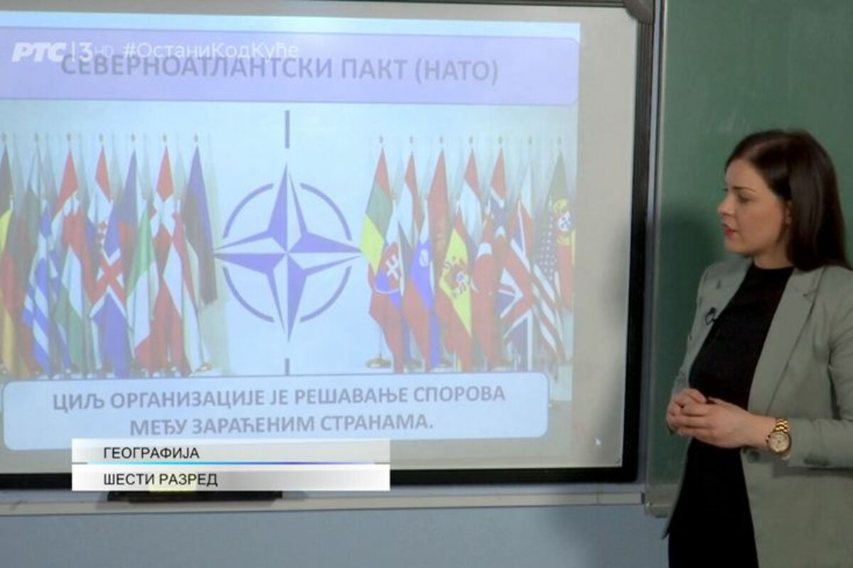 Na času geografije za šesti razred, koji je emitovan preko RTS-a 10. aprila, predavač je NATO prikazao kao ,"vojnu zajednicu čiji je cilj rešavanje sporova između zaraćenih strana". Ovaj način predstavljanja organizacije koja je Srbiju bombardovala čitavih 78 dana, naišla je na revolt velikog broja roditelja, ali i šire javnosti.