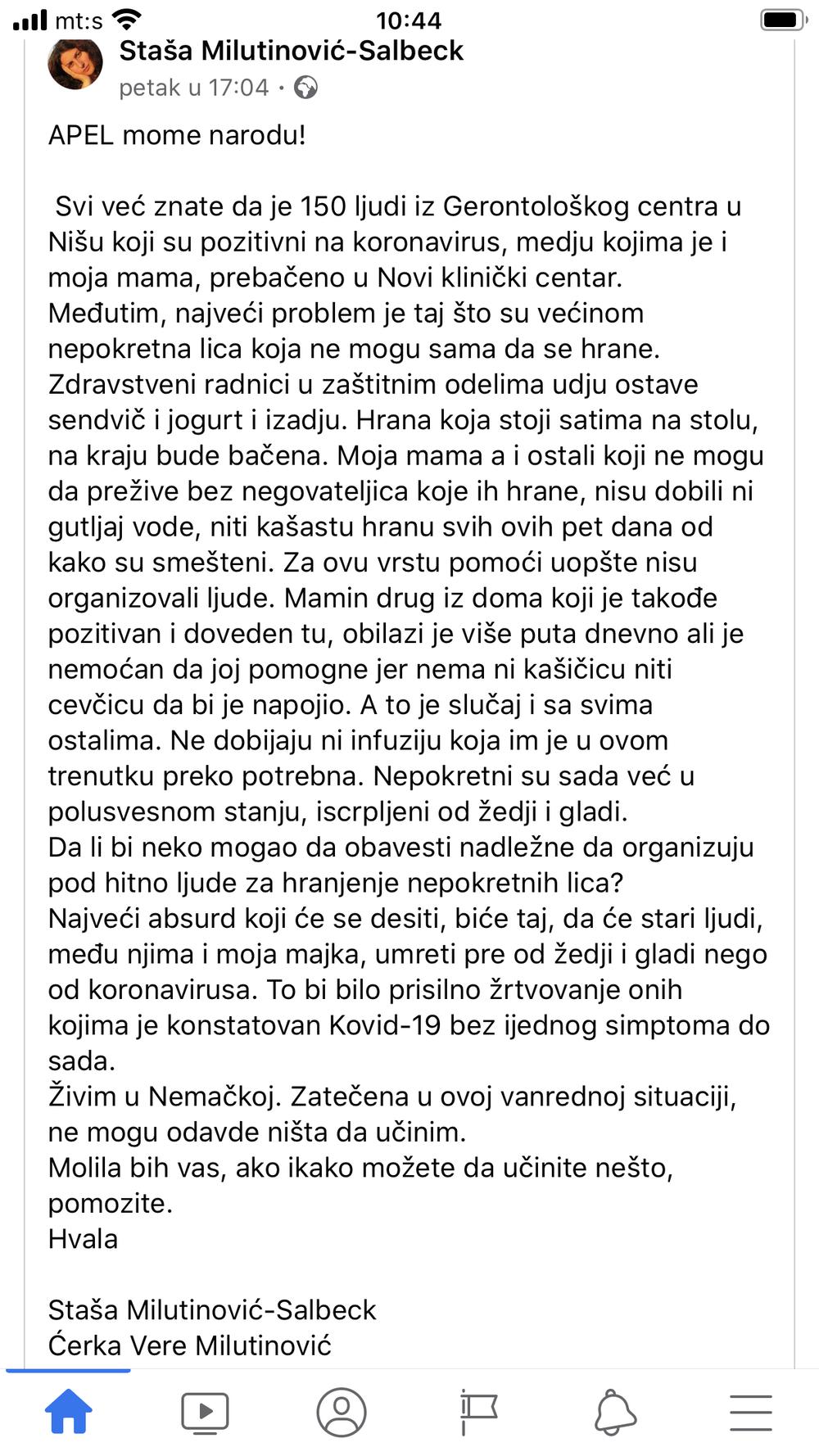 Ova Nišlijka, koja živi u Nemačkoj, u svom obraćanju na društvenim mrežama nazvanom “apel mom narodu”, kaže da od 151 korisnika Gerontološkog centra, koji su od 13. aprila prebačeni u KC nakon što je utvrđeno da su pozitivni na koronavirus, značajan broj čine nepokretni i teško pokretni pacijenti. Ona tvrdi da KC navodno nije organizovao negovatelje koji bi im pomogli oko ishrane.