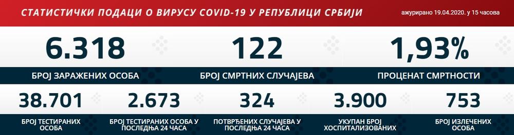U Republici Srbiji je do 15 časova 19. aprila 2020. godine registrovano ukupno 6.318 potvrđenih slučajeva COVID 19. Od poslednjeg izveštaja do 15 časova testirani su uzorci 2.673 osoba od kojih je 324 pozitivno. Hospitalizovano je 3.900 pacijenata.