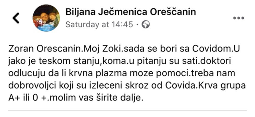 Moj Zoki se sada bori sa kovidom. U jako je teškom stanju, u komi. U pitanju su sati i doktori odlučuju da li krvna plazma može da pomogne - napisala je supuga.
