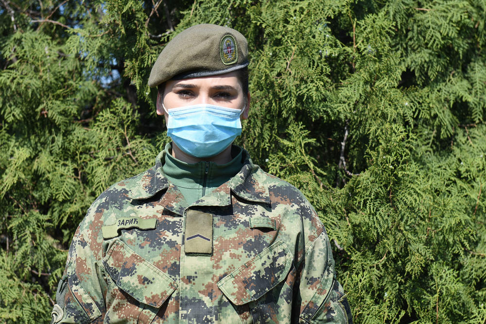 Kako je istakla, ona i kolege snašli su se odlično u obavljanju zadataka tokom vanrednog stanja i pandemije. - Posle prvog slučaja zaraženog koronavirusom u Srbiji podelili smo ambulantu na dva fizički odvojena dela s dva zasebna ulaza – jedan za pacijente s respiratornim simptomima, drugi za pacijente sa svim drugim oboljenjima ili povredama, kao i za pacijente koji dolaze po svoju redovnu terapiju. Bolničari su zaduženi za merenje temperature i trijažu, a potom raspoređuju pacijente po čekaonicama tako da budu na bezbednoj udaljenosti. Zaposleni u našem odeljenju smenjuju se u radu sa potencijalno zaražnim pacijentima na sedmičnom nivou, a napomenula bih i to da smo od početka svi imali zaštitnu opremu – rekla je poručnik Đorđević i dodala da je sve to bilo moguće zahvaljujući „izuzetnom zalaganju stručnih, odgovornih i požrtvovanih zdravstvenih radnika i saradnika u Odeljenju za zdravstvenu zaštitu“. U tom kolektivu nema smenskog rada. Rade svakog dana, imaju pripravnog vozača sanitetskog vozila i medicinskog tehničara koji su dostupni 24 časa dnevno u slučaju potrebe za prevožnjem kovid pozitivnih pacijenata u druge zdravstvene ustanove ili privremene bolnice. U potpunosti se primenjuju mere bezbednosti – kada su direktno izloženi virusu nose zaštitna odela s kapuljačama, dva para rukavica, kaljače, zaštitne kecelje, zaštitne naočare i zaštitne maske. Kako je naglasila poručnik Đorđević „svi su obučeni za pravilno oblačenje, ali i za, što je važnije, svlačenje i odlaganje zaštitnih odela“. - Upravo je ovo period kada rad i trud Odeljenja opšte prakse mogu doći do izražaja – poručila je poručnik Barbara Đorđević. Uvek dajem sve od sebe Razvodnik Marija Zarić svakodnevno je bila angažovana na uređenju privremenih bolnica za smeštaj i lečenje zaraženih koronavirusom na Beogradskom sajmu, na Karaburmi, u Štark areni i u sportskim halama „Ranko Žeravica“ i „Aleksandar Nikolić“. Kako kažu njene kolege, prilikom angažovanja u borbi protiv širenja virusa nije štedela sebe, prednjačila je u radu i bila je pravi primer kako treba postupati pri realizaciji dodeljenih zadataka.