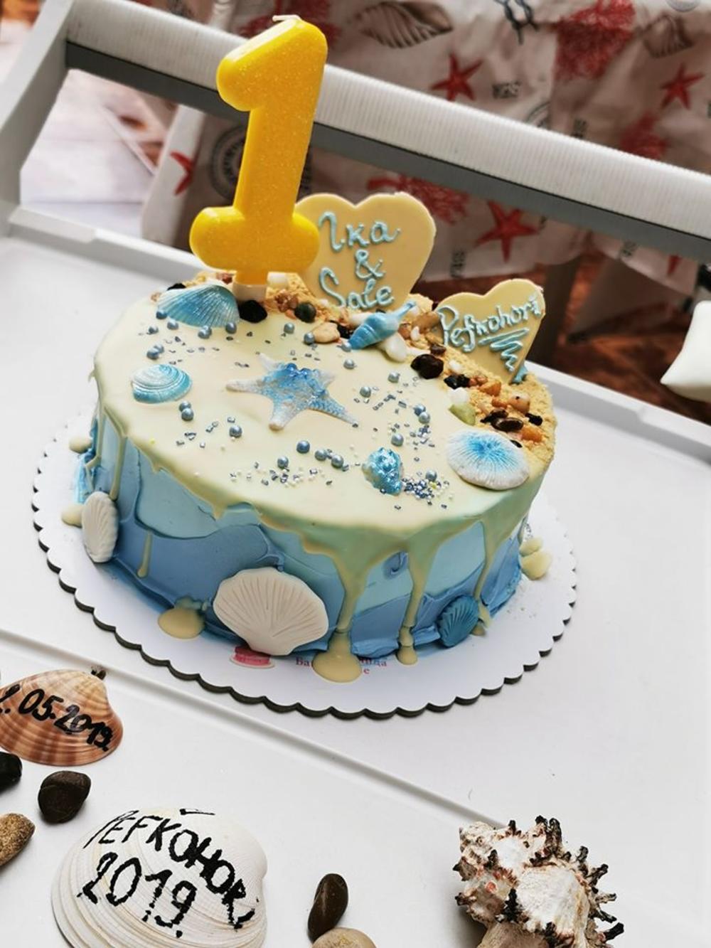 Mediteranska hrana, morski rekviziti, grčka zastava... Sve je tu, uključujući i tortu koja asocira na Pefkohori, more i plažu.