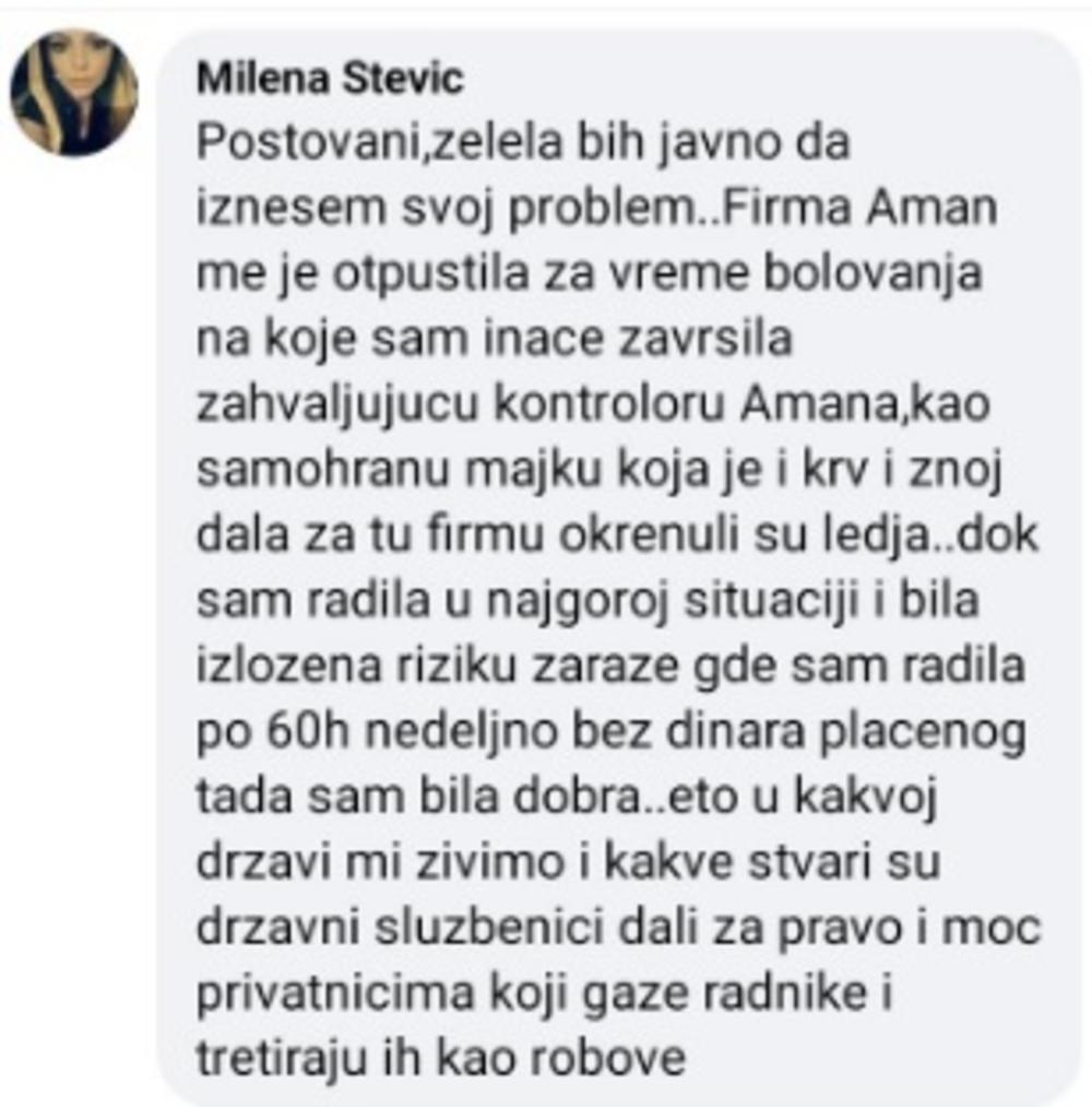 Žena koja se na Tviteru predstavlja kao Milena Stević, podelila je sa pratiocima status u kojem tvrdi da je, kao samohrana majka, ostala bez posla dok je bila na bolovanju, i to usred pandemije koronavirusa.