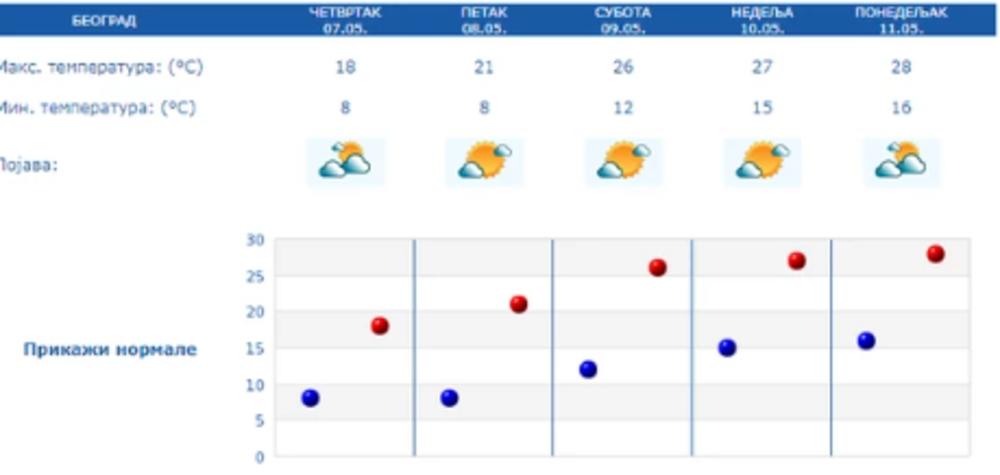 Temperatura će u Beogradu u nedelju dostići i 28 stepeni, a biće i delimično oblačno. U Nišu će, uz malo oblaka, biti do 27 stepeni. Sunčano do mestimično oblačno biće i u Novom Sadu, uz temperaturu do čak 28 stepeni.