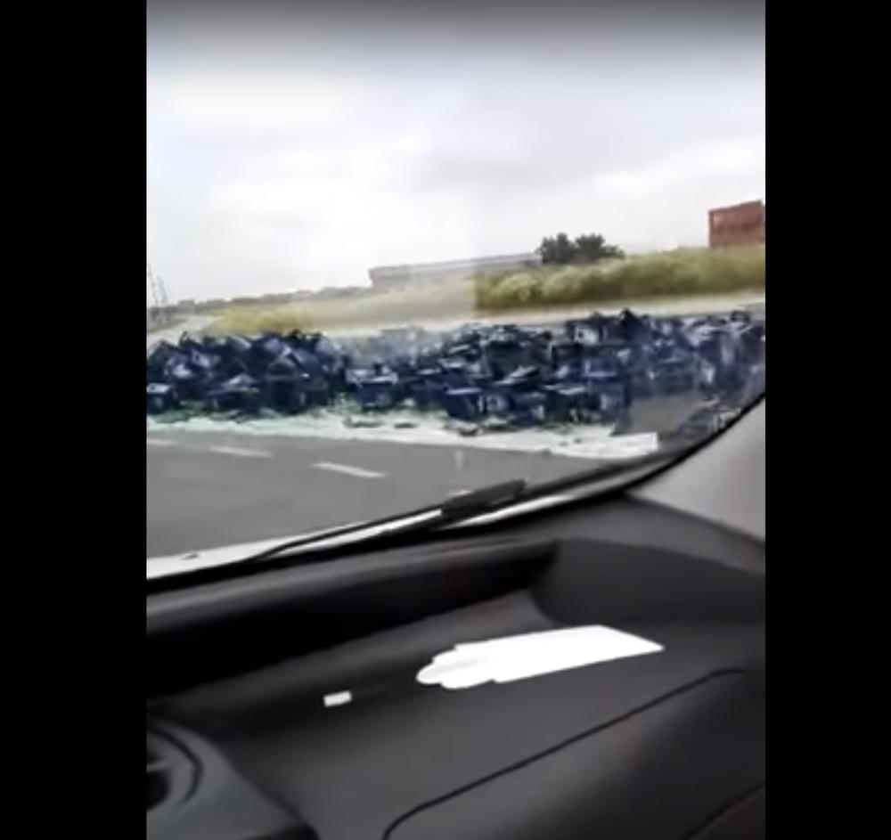 Više desetina gajbi piva ispalo je jutros iz kamiona i razbilo se na putu na obilaznici oko Novog Sada kod novoizgrađenog nadvožnjaka