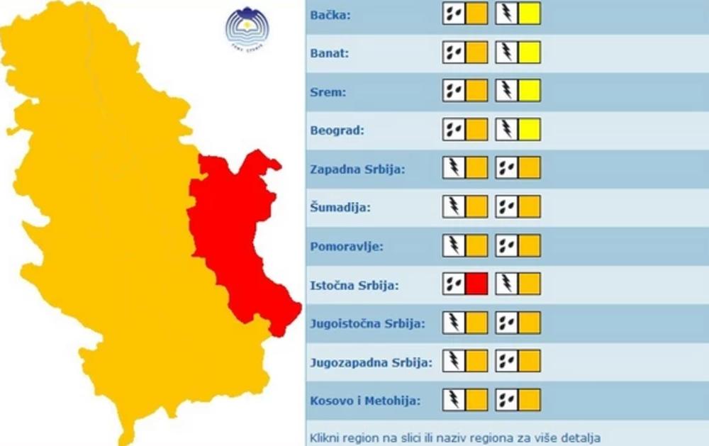“Danas se u krajevima južno od Save i Dunava očekuju intenzivni grmlјavinski procesi sa lokalnom pojavom grada, u zoni plјuska i jakim ili olujnim vetrom, kao i količinom padavina u većini mesta od 20 do 40 mm za 24 h, a lokalno i više, naročito na području Borskog okruga (istočna Srbija) gde može pasti i više od 60 mm za 24 h”, stoji u upozorenju RHMZ.