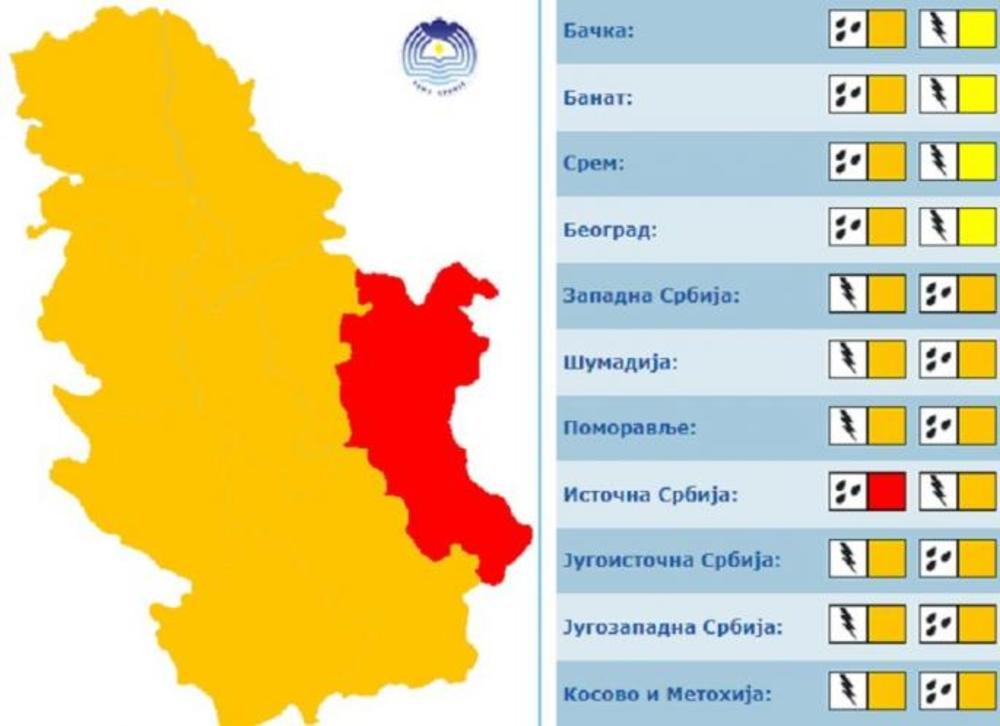 Istočna Srbija je danas crvena na mapi meteoalarma. U ovom delu zemlje se očekuju kiša, grmljavina i veoma opasno vreme.