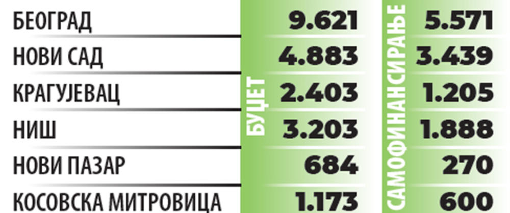 Kragujevački univerzitet upisaće 2.403 studenta na budžet, a njih 1.205 će sami plaćati svoje školovanje. Univerzitet u Nišu o trošku države upisaće 3.203 studenta, a samofinansirajućih će biti 1.888. U Novom Pazaru, na budžet će biti upisana 684 akademaca, a samofinansirajućih će biti 270. Univerzitet u Prištini sa sedištem u Kosovskoj Mitrovici upisaće 1.173 studenta o trošku države, dok će njih 600 studirati o svom trošku.
