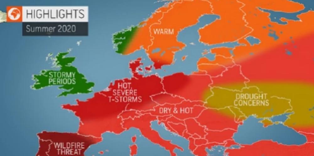 Delom Evrope, od juga Francuske pado Ukrajine prema prvim prognozama AccuWeathera očekuje se vruće i suvo vreme, a najavljeni su i brojni toplotni talasi. Sa druge strane opasnost od razornih požara ovaj meteorološki servis najavio je za Španiju i Portugal.