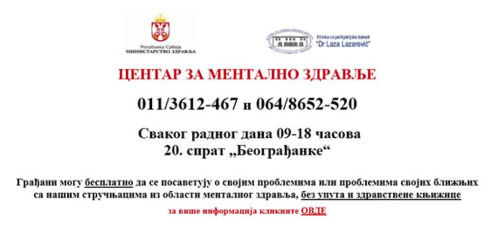 Dodaje, da su građani kontaktirali Kliniku za psihijatrijske bolesti "Laza Lazarević", uglavnom zbog pitanja kako da se izbore sa strahom i stresom od koronavirusa.