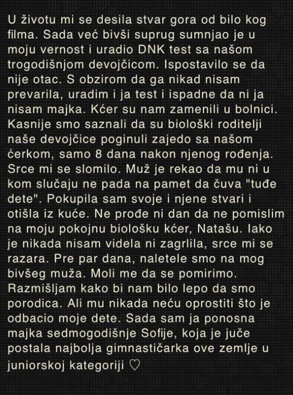 Dodaje da je sada ponosna majka sedmogodišnje Sofije koja je postala najbolja gimnastičarka zemlje u juniorskoj kategoriji.