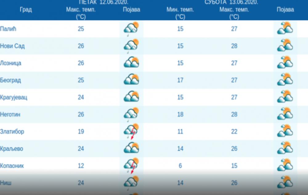 Na tabeli koju je objavio RHMZ prikazano je da će najtopliji gradovi danas biti Novi Sad, Loznica i Negotin, a da će na Kopaoniku biti samo 12 stepeni!