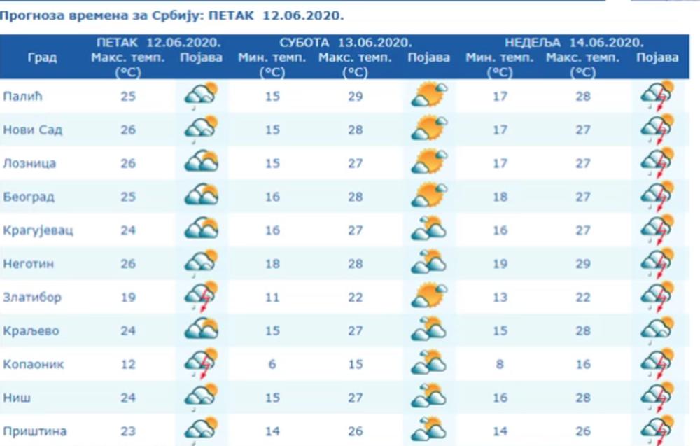 U nedelju umereno do potpuno oblačno, ali u većini predela suvo, dok se na severu Vojvodine očekuju lokalni pljuskovi sa grmljavinom. Maksimalna temperatura za vikend od 25 do 29°C.