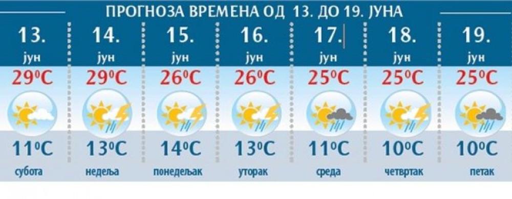 Najniža temperatura će biti od 13 do 18, a najviša od 25 do 29 stepeni.