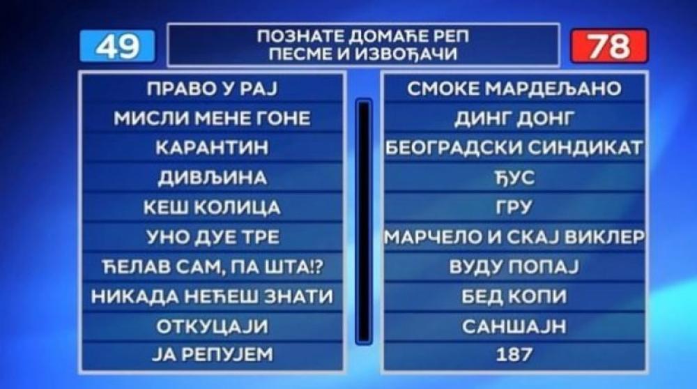 Najpoznatiji kviz "Slagalica" redovno iznedri bisere, zbog kojih se cela Srbija nasmeje do suza, a sinoć smo imali priliku da vidimo kako dva takmičara kubure sa spojnicama - trebalo je da spoje imena rep muzičara sa njihovim pesmama.