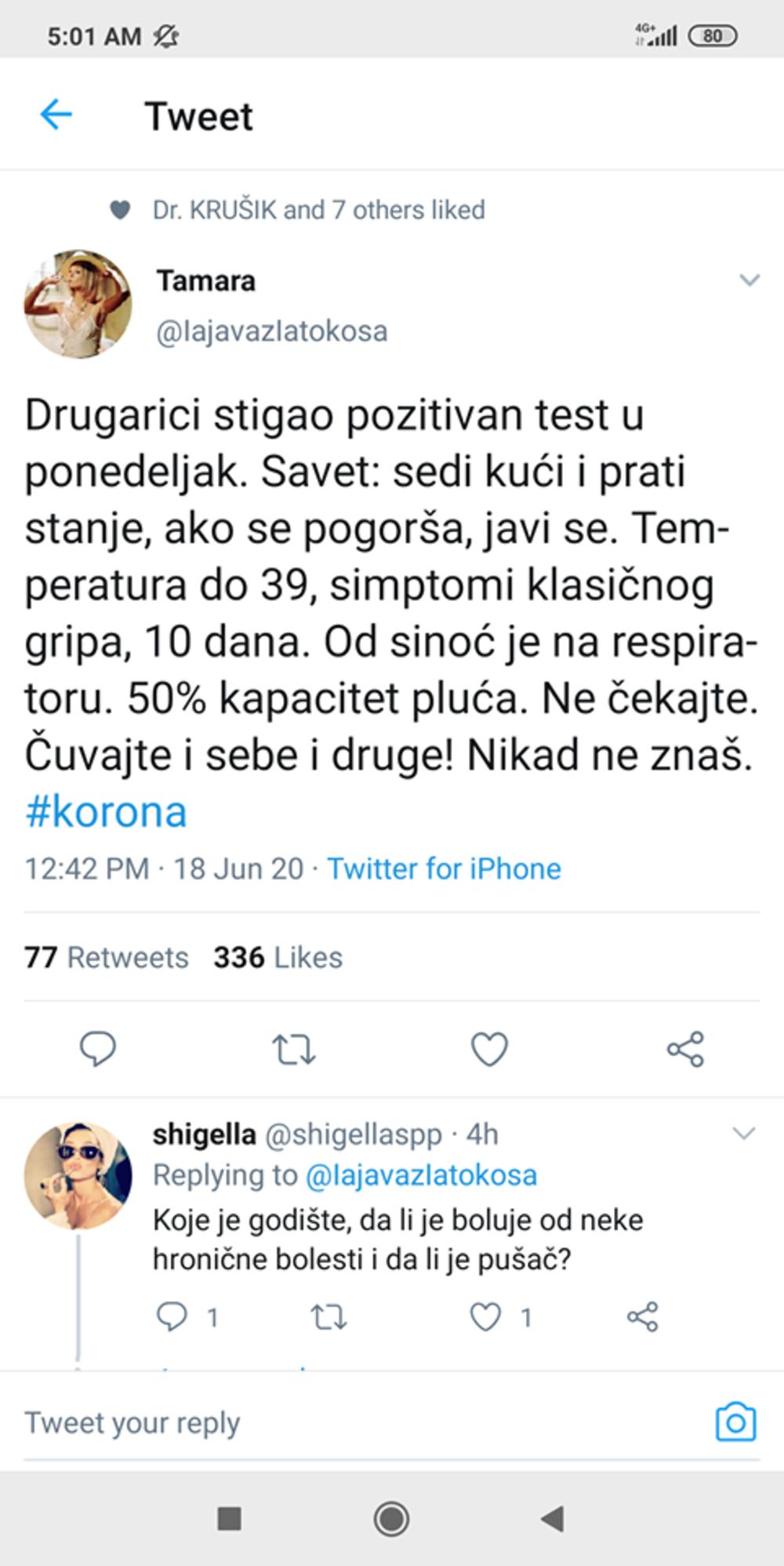 - Drugarici stigao pozitivan test u ponedeljak. Savet: Sedi kući i prati stanje, ako se pogorša, javi se. Tempreatura do 39, simptomi klasičnog gripa, 10 dana. Od sinoć je na respiratoru. 50% kapacitet pluća. Ne čekajte. Čuvajte sebe i druge. Nikada ne znaš, napisala je devojka na svom Tviter profilu.