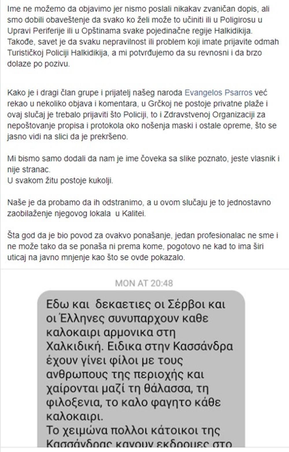 - Ime ne možemo da objavimo jer nismo poslali nikakav zvaničan dopis, ali smo dobili obaveštenje da svako ko želi može to učiniti ili u Poligirosu u Upravi Periferije ili u Opštinama svake pojedinačne regije Halkidikija. Takođe, savet je da svaku nepravilnost ili problem koji imate prijavite odmah Turističkoj Policiji Halkidikija, a mi potvrđujemo da su revnosni i da brzo dolaze po pozivu. Kako je i dragi član grupe i prijatelj našeg naroda Evangelos Psarros već rekao u nekoliko objava i komentara, u Grčkoj ne postoje privatne plaže i ovaj slučaj je trebalo prijaviti što policiji, to i zdravstvenoj organizaciji za nepoštovanje propisa i protokola oko nošenja maski i ostale opreme, što se jasno vidi na slici da je prekršeno. Mi bismo samo dodali da nam je ime čoveka sa slike poznato, jeste vlasnik i nije stranac. U svakom žitu postoje kukolji. Naše je da probamo da ih odstranimo, a u ovom slučaju je to jednostavno zaobilaženje njegovog lokala u Kalitei. Šta god da je bio povod za ovakvo ponašanje, jedan profesionalac ne sme i ne može tako da se ponaša ni prema kome, pogotovo ne kad to ima širi uticaj na javno mnjenje kao što se ovde pokazalo - stoji na kraju objave u grupi Live from Greece.