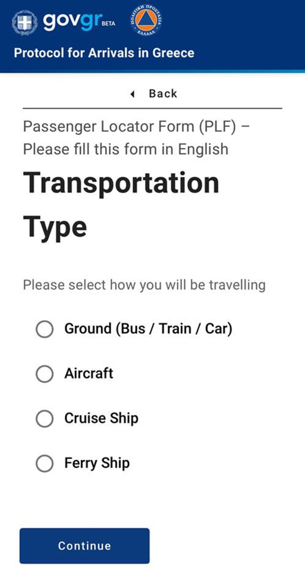 Formular Pre objašnjenja svakog koraka u formularu nađite ovde svoj PAK i treba da potvrdite da ste pročitali osnovne informacije o putovanju u Grčku na prvoj stranici na sajtu. Na prvoj strani obrasca treba da navedete vrstu prevoza: potrebno označiti da li se dolazi kopnom, avionom, brodom, trajektom. Ako označite kopno, onda se označava da li putujete autobusom, vozom ili kolima. Ako označite autobus onda se unose tablice, ime prevoznika, broj sedišta u vozilu, datum dolaska i mesto prelaska granice. Za opciju graničnog prelaza navodi se samo Bugarska, i to kod Promahomasa. Ako označite automobil onda samo tablice, datum dolaska i granični prelaz Promahomas kod Bugarske. Ako označite avion, onda ćete morati upisati ime avio kompanije, broj leta, datum dolaska, aerodrom na koji se sleće. Ako postoji i unutrašnji let (recimo od Atine do Rodosa) onda se unose i ti detalji. Ovde postoji 20 opcija za ulazak u zemlju. Takođe postoji boks koji štiklirate ukoliko idete privatnim letom. Za putovanje brodom ili trajektom morate da navedete ime kompanije, ime broda/trajekta, broj kabine odnosno broj sedišta, kada napuštate brod/trajekt. Pristaništa se razlikuju za trajekte i za brodove, s tim da ćete u zavisnosti od prevoznog sredstva pristajati u različitim lukama.