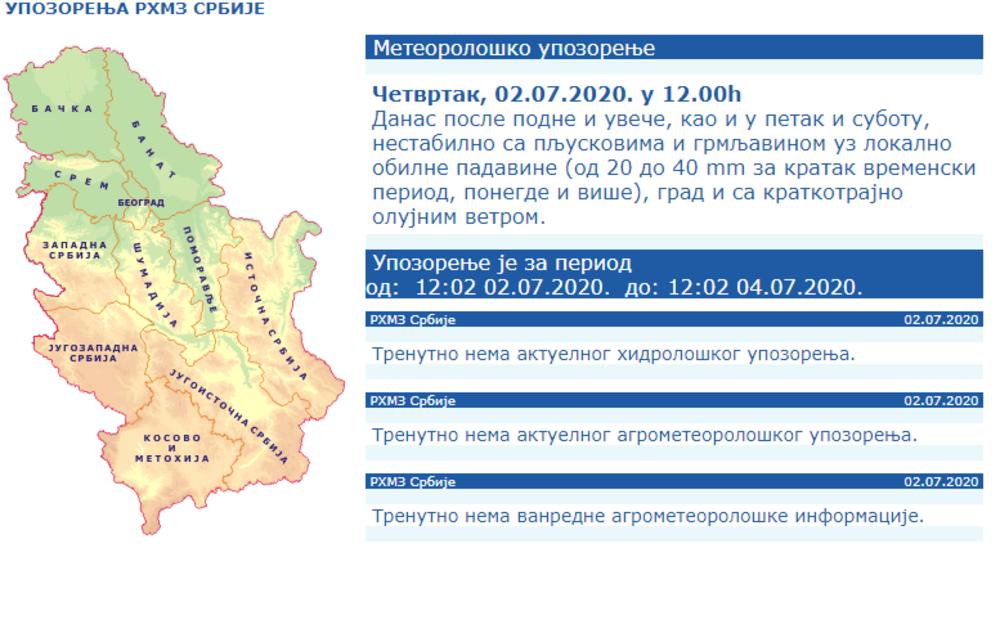 - Danas posle podne i uveče, kao i u petak i subotu, nestabilno sa pljuskovima i grmljavinom uz lokalno obilne padavine (od 20 do 40 mm za kratak vremenski period, ponegde i više), grad i sa kratkotrajno olujnim vetrom - stoji u objavi od 12 časova.