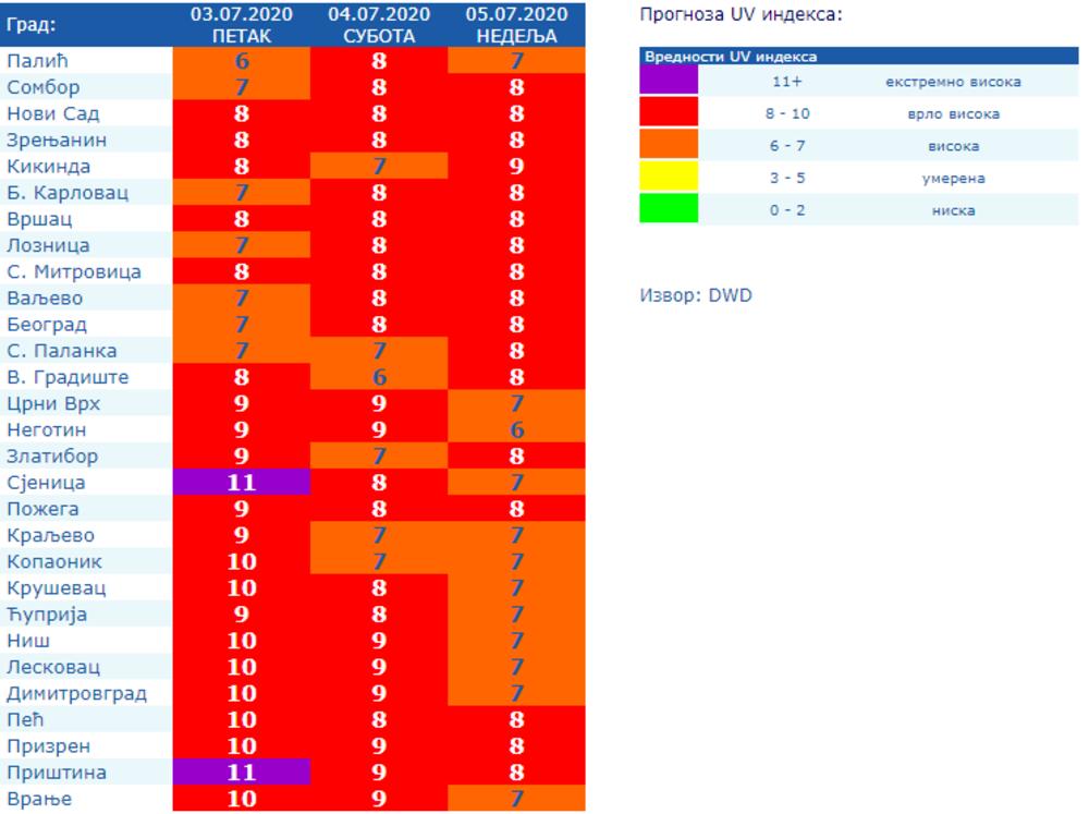 Danas će UV indeks biti najviši u Sjenici i Požegi - čak 11, dok će na jugu Srbije, u Vranju, Nišu, Leskovcu, Dimitrovgradu, ali i na Kopaoniku, u Peći, Prizrenu i Kruševcu biti 10.