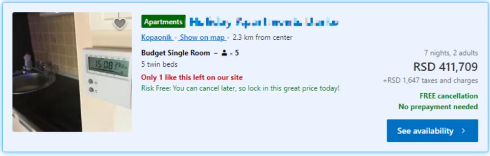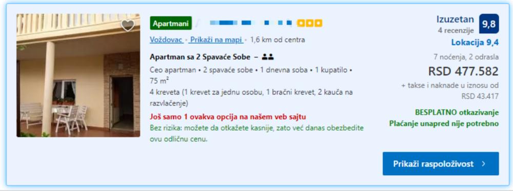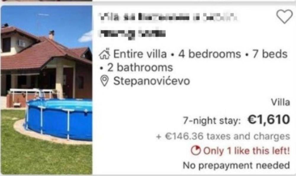 Mi smo ovo proverili na sajtu Booking.com. Cena od 7.000 evra za sedam noćenja je za više od sedam osoba, dok je cena za isti broj noćenja za dve osobe nešto veća od 411.000 dinara, što je skoro 3.500 eura. Za ovaj novac dobijate i besplatan WiFi, kao i privatni parking.