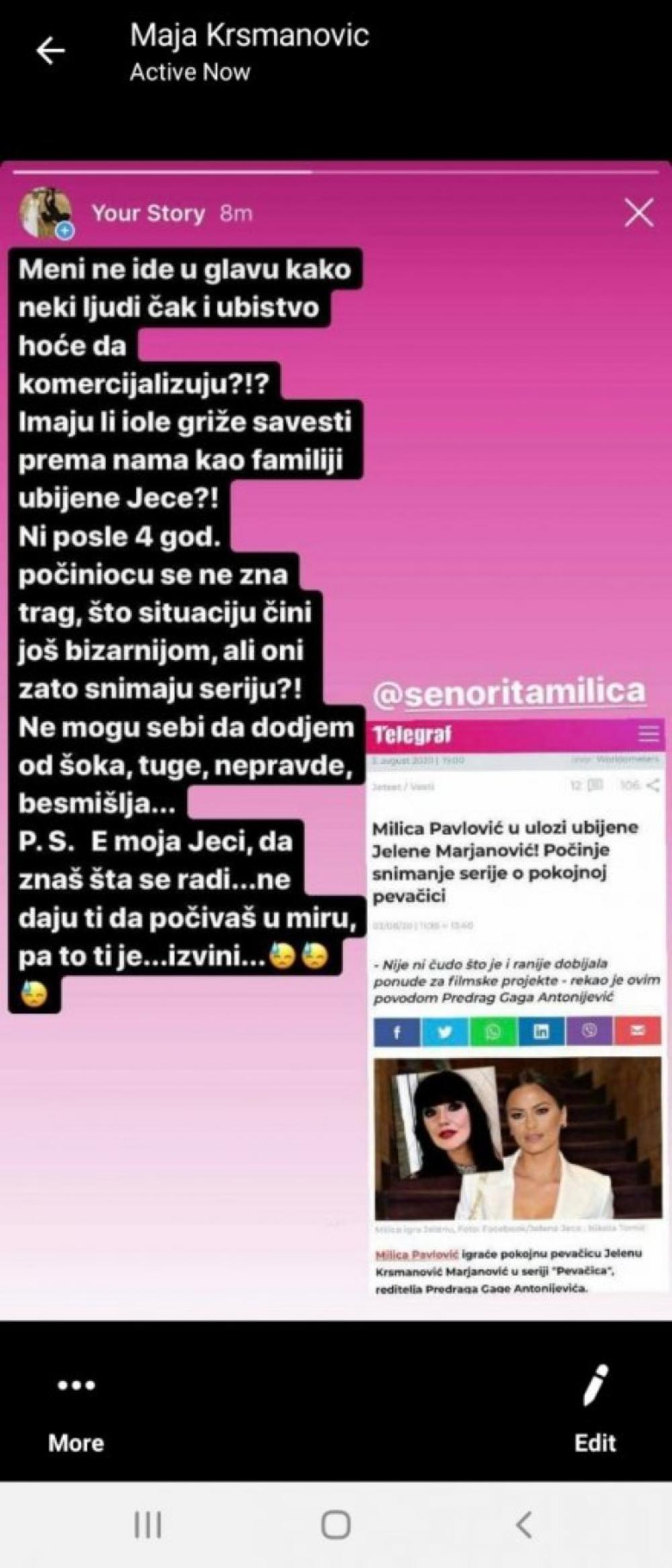 To je mnogima zasmetalo, pa i samoj sestri pokojne pevačice koja se tim povodom oglasila na svom instagram nalogu, gde je izjavila kako neko uopšte može da komercijalizuje ubistvo te da li uopšte takvi ljudi imaju griže savesti osećanja o tome kako se porodica ubijene oseća.
