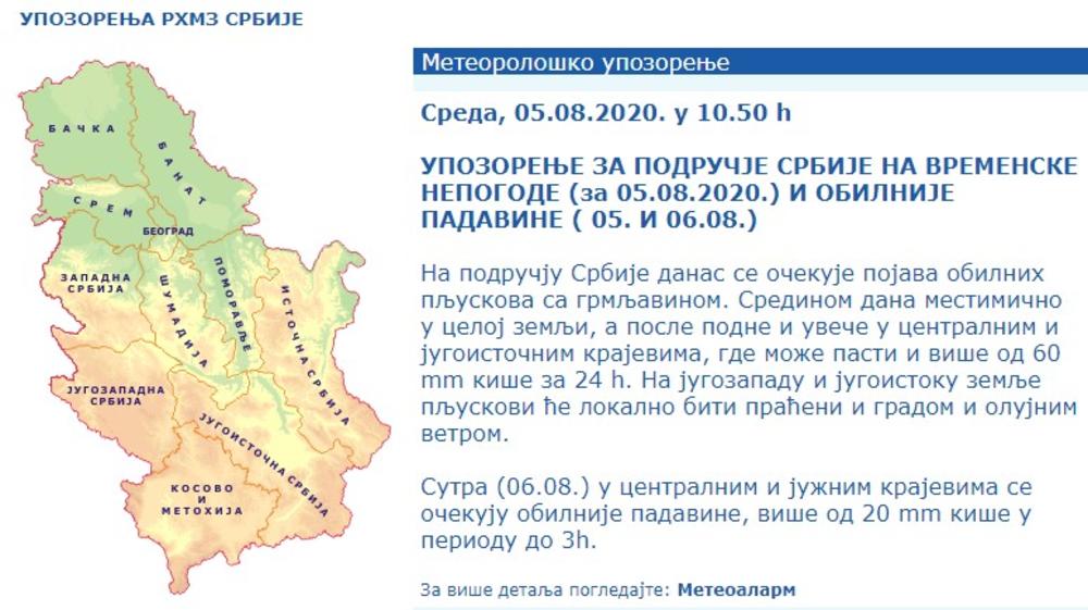 Sredinom dana pljuskovi se očekuju mestimično u celoj zemlji, a posle podne i uveče u centralnim i jugoistočnim krajevima, gde može pasti i više od 60 mm kiše za 24 sata. Na jugozapadu i jugoistoku zemlje pljuskovi će lokalno biti praćeni i gradom i olujnim vetrom. U pojedinim delovima zemlje aktiviran je crveni meteoalarm.