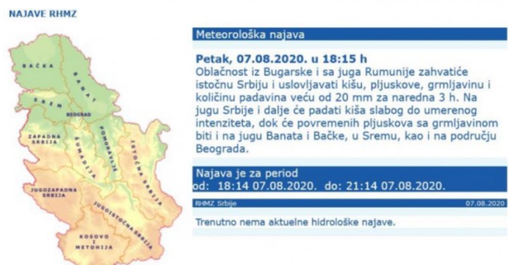 Kako navodi RHMZ, oblačnost iz Bugarske i sa juga Rumunije zahvatiće istočnu Srbiju i uslovlјavati kišu, plјuskove, grmlјavinu i količinu padavina veću od 20 mm za naredna 3 h.