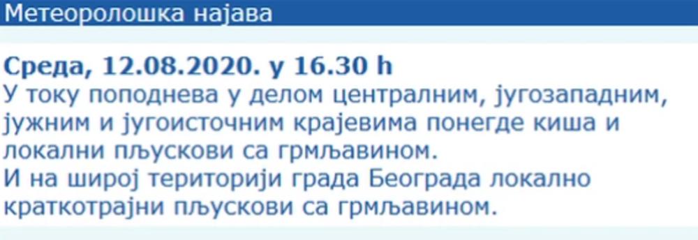 "Na široj teritoriji Beograda lokalno kratkotrajni pljuskovi sa grmljavinom", najavljuju na sajtu Republičkoh hidrometeorološkog zavoda. Padavine neće zaobići još nekoliko delova Srbije.