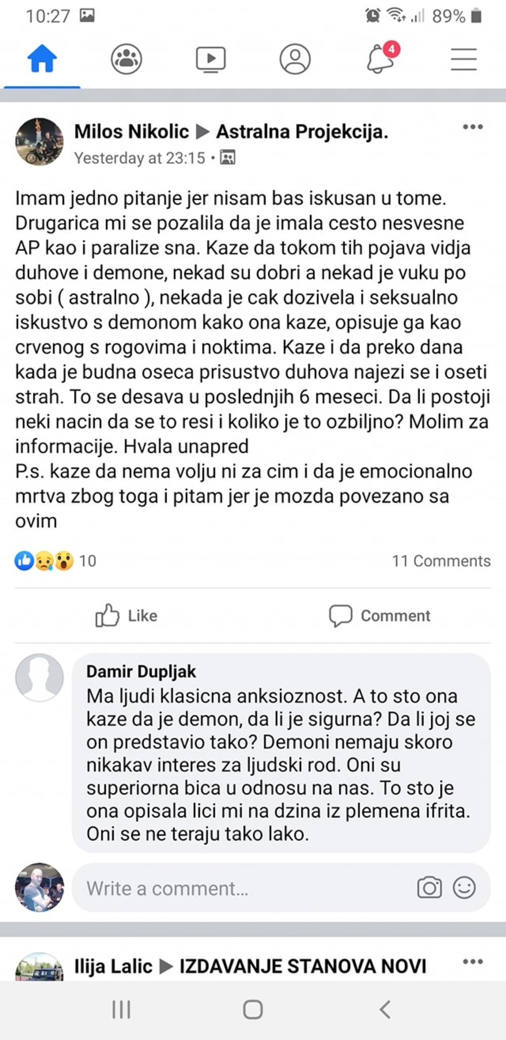 Jedan čovek je članovima grupe ispričao kako njegova drugarica ima astralne projekcije i paralize sna i da tokom tih pojava viđa duhove i demone