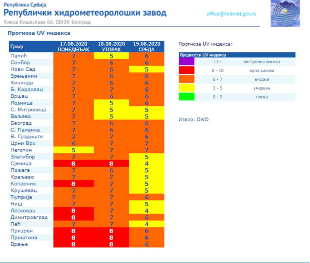 Indeks ultraljubičastog zračenja ovih biće visok, a u nekim gradovima i vrlo visok i u crvenoj boji.