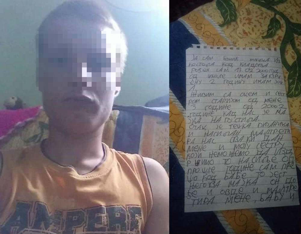 - Živim sa ocem i sestrom starijom od mene tri godine od 2002. godine, kada nas je majka napustila. Otac je teška pijanica i nasilan je. Maltretira nas svaki dan. Mene i moju sestru koji ne možemo da izdržimo to nasilje. Od prošle godine sam prešao kod babe, on dođe i ovde i maltretira babu, sestru i mene - napisao je dečak i potražio pomoć da se izbavi iz situacije iz koje ne može da se izvuče sam.