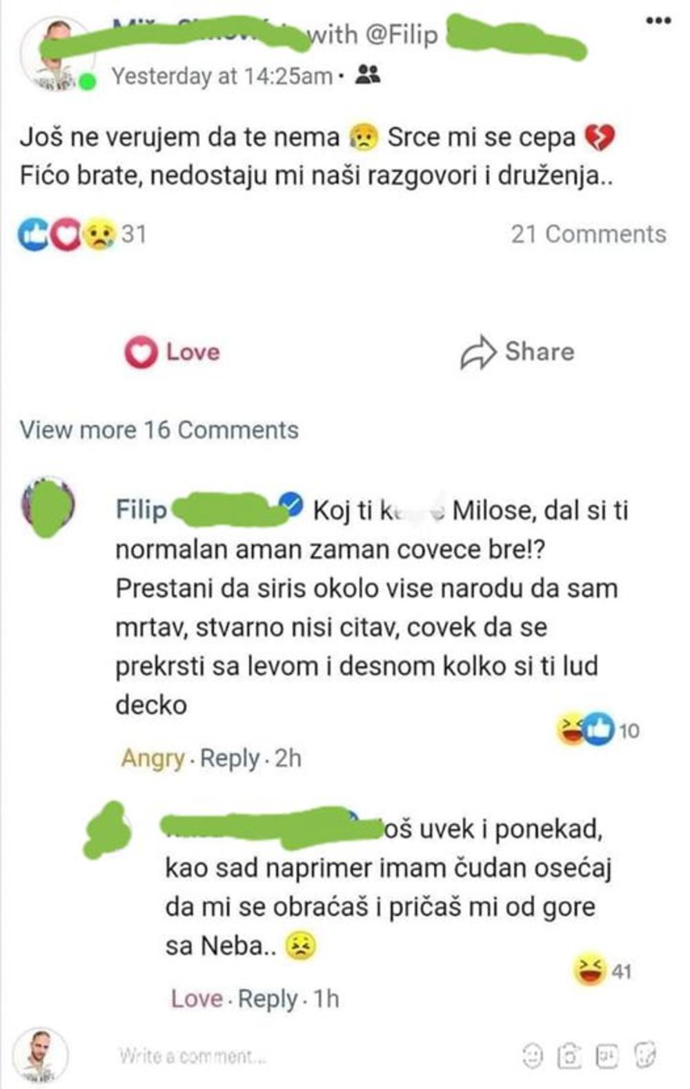 - Koj ti ku*ac Miloše, dal si ti normalan aman zaman čoveče? Prestani da širiš okolo više narodu da sam mrtav, stvarno nisi čitav, čovek da se prekrsti levom i desnom kolko si ti lud.