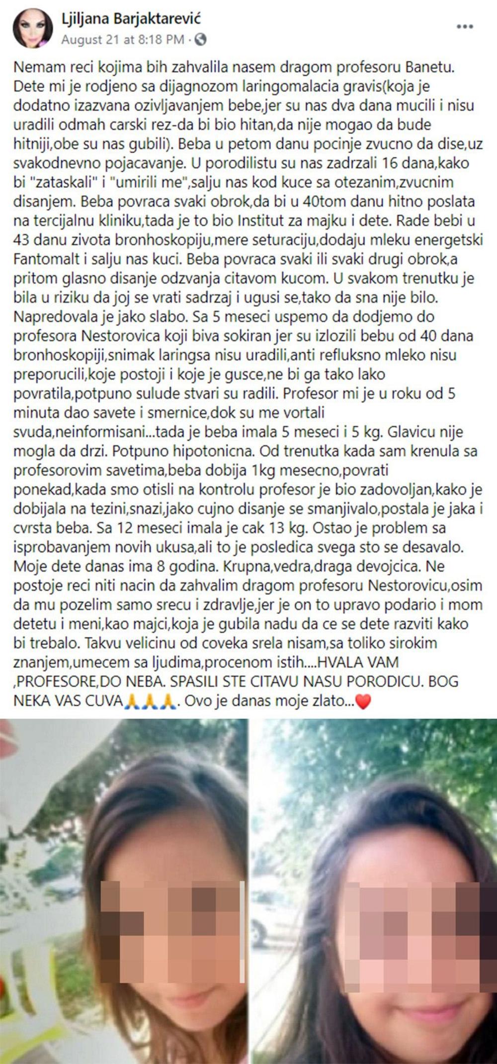 - Nemam reči kojima bih zahvalila našem dragom profesoru Banetu. Dete mi je rođeno sa dijagnozom laringomalacia gravis (koja je dodatno izazvana oživljavanjem bebe, jer su nas dva dana mučili i nisu uradili odmah carski rez - da bi bio hitan, da nije mogao da bude hitniji, obe su nas gubili). Beba u petom danu počinje zvučno da diše, uz svakodnevno pojačavanje. U porodilištu su nas zadržali 16 dana, kako bi "zataškali" i "umirili me", šalju nas kući sa otežanim, zvučnim disanjem. Beba povraća svaki obrok, da bi u 40-om danu hitno bila poslata na tercijalnu kliniku, tada je to bio Institut za majku i dete - napisala je mama Ljiljana Barjaktarević u Fejsbuk grupi Poštovaoci lika i djela dr Branimira Nestorovića.
