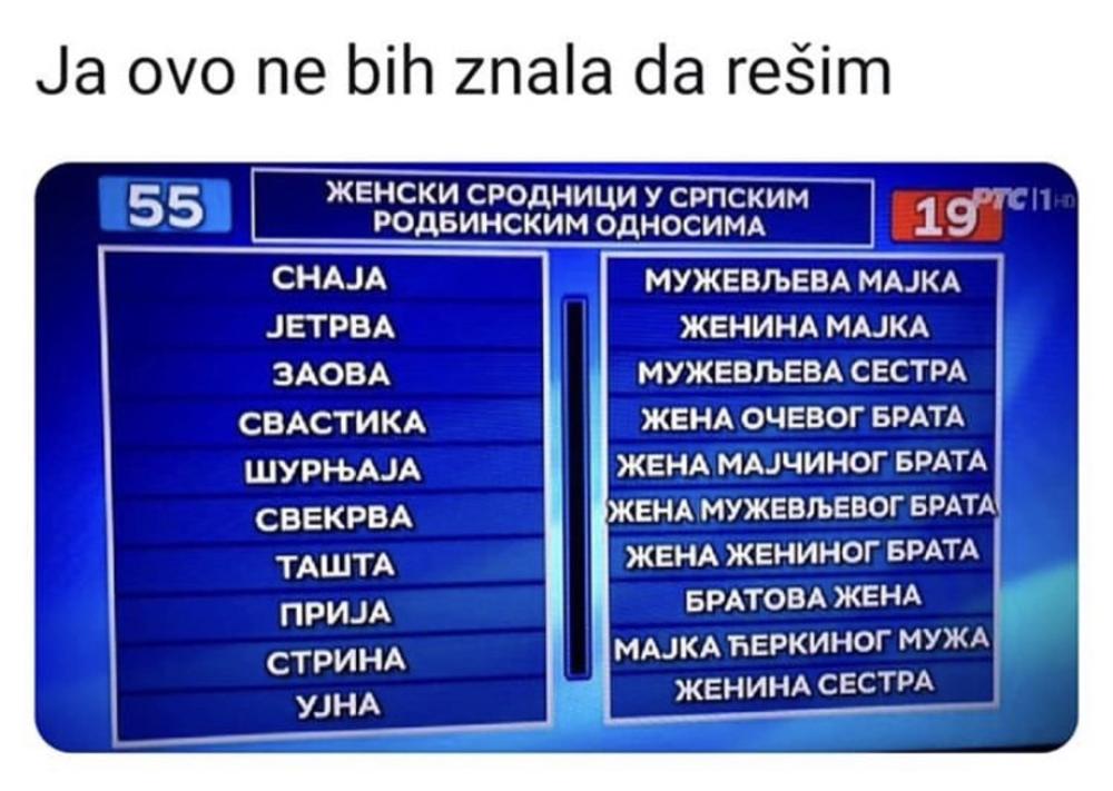 Na društvenim mrežama je krenula da se širi slika iz poznatog kviza "Slagalica" koja se baš bavi tematikom rodbinskih odnosa u Srbiji.