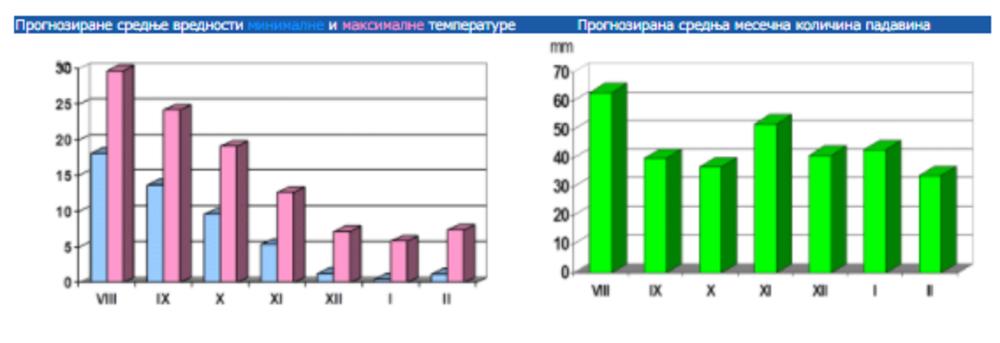 Srednja minimalna temperatura vazduha u januaru imaće vrednosti iznad višegodišnjeg proseka, pri čemu će njena vrednost u proseku biti viša za oko 1.5ºS u odnosu na višegodišnji prosek. U Beogradu i široj okolini predviđa se vrednost januarske srednje minimalne temperature vazduha od 0.5ºS. Srednja maksimalna temperatura vazduha u januaru biće iznad višegodišnjeg proseka, sa vrednostima u proseku višim za oko 2.0ºS u odnosu na višegodišnji prosek. U Beogradu i široj okolini srednja maksimalna temperatura vazduha tokom januara biće oko 5.8ºS. Mesečna suma padavina tokom januara biće ispod ili u granicama višegodišnjeg proseka sa vrednostima u proseku za oko 10 mm nižim u odnosu na višegodišnji prosek. U Beogradu i široj okolini januarska suma padavina iznosiće oko 43 mm.