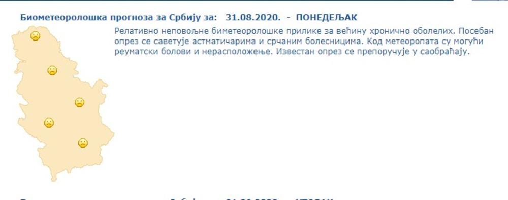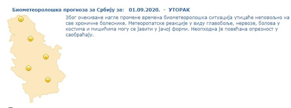 Osim toga, RHMZ je na svom sajtu objavio i beometeorološku prognozu koja se posebno odnosi na meteoropate, odnosno, one koji burno reaguju na ekstremne promene vremena.
