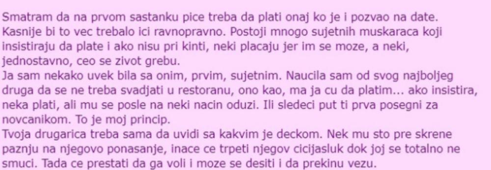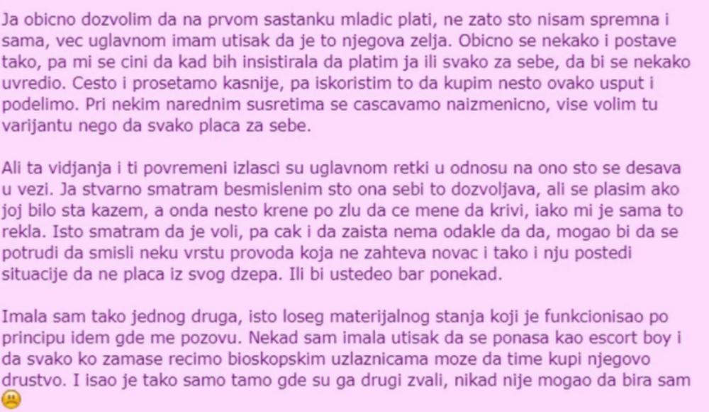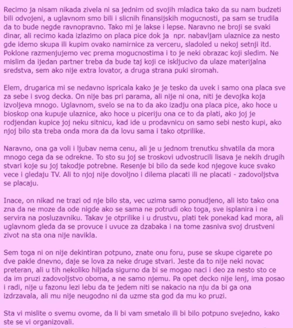 Forumašica na forumu Ana.rs napisala je da njena prijateljica sve plaća svom dečku - kartu za bioskop, piće, izlaske....