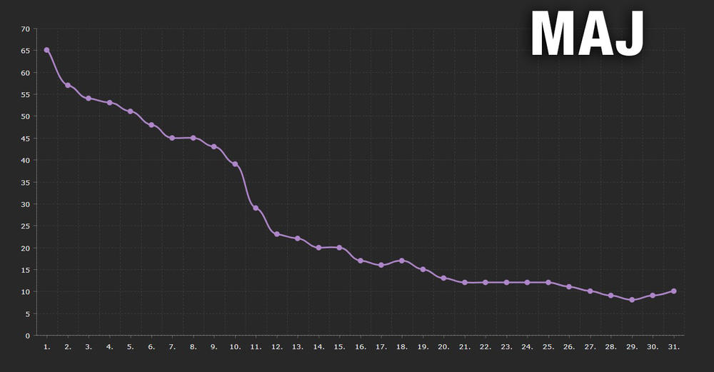 U maju je situacija bila povoljnija. Broj životno ugroženih se smanjivao iz dana u dan, pa je tako najviše pacijenata na respiratorima u maju bilo upravo 1. maja - 65, dok je u čitavoj Srbiji najmanje ljudi na respiratorima u maju, ali i od početka beleženja životno ugroženih, bilo 29. maja - samo osmoro.