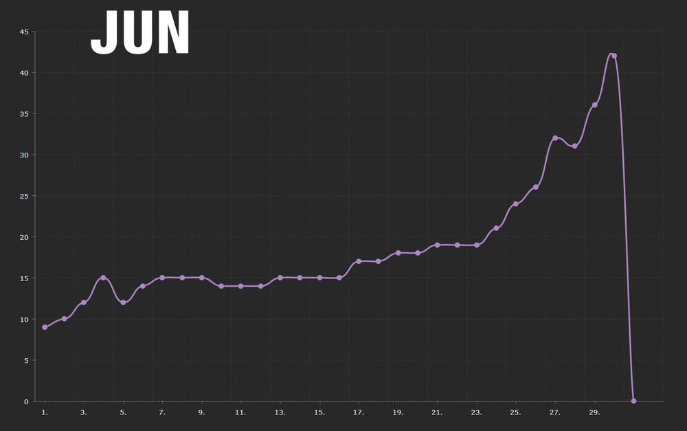 Osim prvog dana juna, kada je samo devetoro ljudi bilo na respiratorima, ostalih dana je brojka bila dvocifrena i rasla je postepeno. Danima nije bilo promena, te je 15 ljudi bilo na respiratorima 13, 14, 15. i 16. juna, a 19 21, 22. i 23. juna.